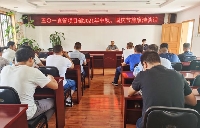 9月6日下午,五〇一直管项目部开展中秋、国庆节前廉洁谈话,会议由党支部书记王敏主持,直管部班子成员、科室负责人及项目经理共计21人参会。