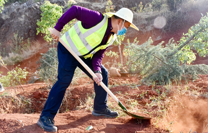 活动一开始,李兴奎和张晓峰与各位干部职工一起拿起铁锹、锄头,分为两人一组或三五一组,将一棵棵树苗扶正放入坑中,奋锄挖土、挥锹填土、踩实压紧、修整树苗、提桶浇水、挂牌,每一道工序都严格按照标准进行,衔接有序,配合默契。现场一片火热,仅用1个多小时,就把原本荒凉的山坡变得绿意盎然,生机勃勃。