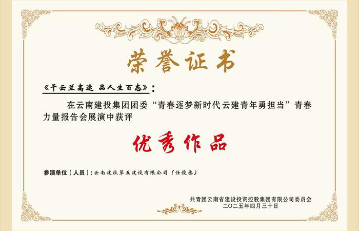 2025年五四青年节,集团举办“青春逐梦新时代 云建青年勇担当”青春力量报告会。展演中,由公司团委、市政路桥四部联合编创的脱口秀《干云兰高速,品人生百态》作品获评“优秀作品”。