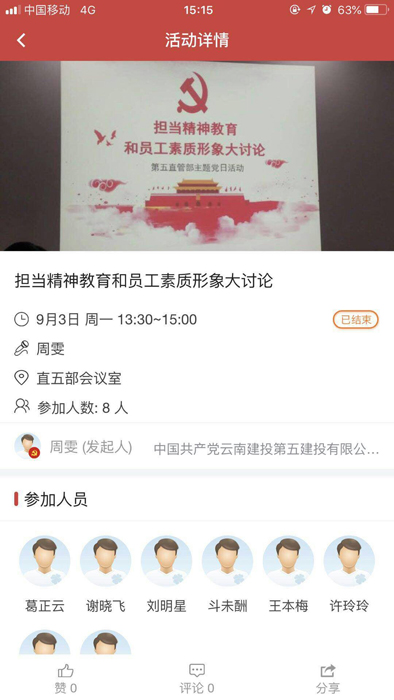 技术支持: 方森科技9月3日下午,直五部党支部通过云岭APP“互联网+党建”平台开展主题党日活动,开展“担当精神和员工素质形象大讨论”活动,22名党员干部职工参加主题党日活动。
