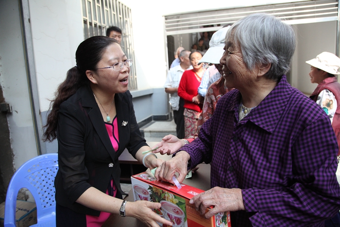 退管会的工作人员给参赛老职工们发送礼品