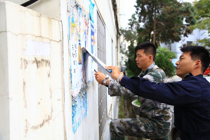 物业公司、保卫部共10余名志愿者铲除“牛皮癣”