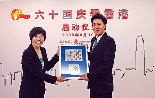 6月10日,为庆祝新中国60周年华诞,香港旅游发展局与中国青年报社联合举办的“六十国庆看香港”系列活动正式启动。香港特别行政区政府驻北京办事处副主任陈选尧、中国青年报总编辑陈小川、香港旅发局中国内地总监叶贞德和著名歌唱演员蔡国庆(从左至右)一同为活动揭幕。
