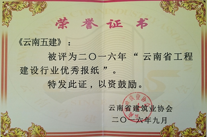 9月21日,云南省建筑业协会发布了《关于对2016年度云南省工程建设行业优秀期刊、报纸的表彰决定》(云建协[2016]32号)。公司《云南五建》报获评“云南省工程建设行业优秀报纸”。 《云南五建》报自2011年1月开办,至2016年9月共发行69期,常规分为4个版面,内容涉及公司新闻、管理动态、工程动态、教育培训、安全生产...