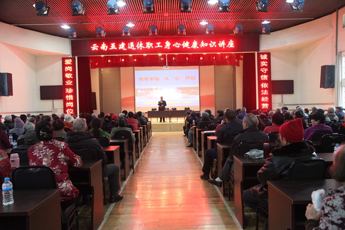 12月29日,在2016年即将到来之际,公司诚邀了云南省演讲学会常务理事、国家二级心理咨询师朱景忠老师,为退休职工上了一堂身心健康知识讲座,现场共有210多名退休职工参加。 朱景忠老师以晚年幸福从“心”开始为主题,以幽默风趣、通俗易懂的语言和图文并茂的形式,从老年人要调整心态,找准位置;少些抱怨,多些宽容;克制愤怒,与人为...
