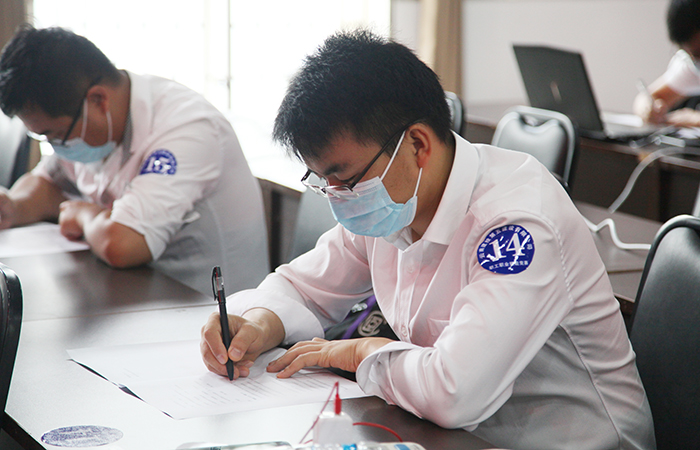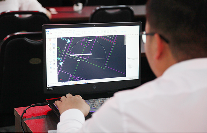 选手们在40分钟的笔试过后休息片刻,马上进入实操环节,现场时不时传出操作键盘和鼠标的机械碰撞声,大家时而聚精会神盯着操作软件思考,时而双手紧密配合在操作界面上来回切换。6.5小时的实操时间,对于熟练的选手来说绰绰有余,对新手来说是争分夺秒。一周之前,公司邀请广联达科技股份有限公司老师通过“钉钉”软件线上教学,详细讲解软件基本功能、使用方法,为此次参赛选手打好基础。