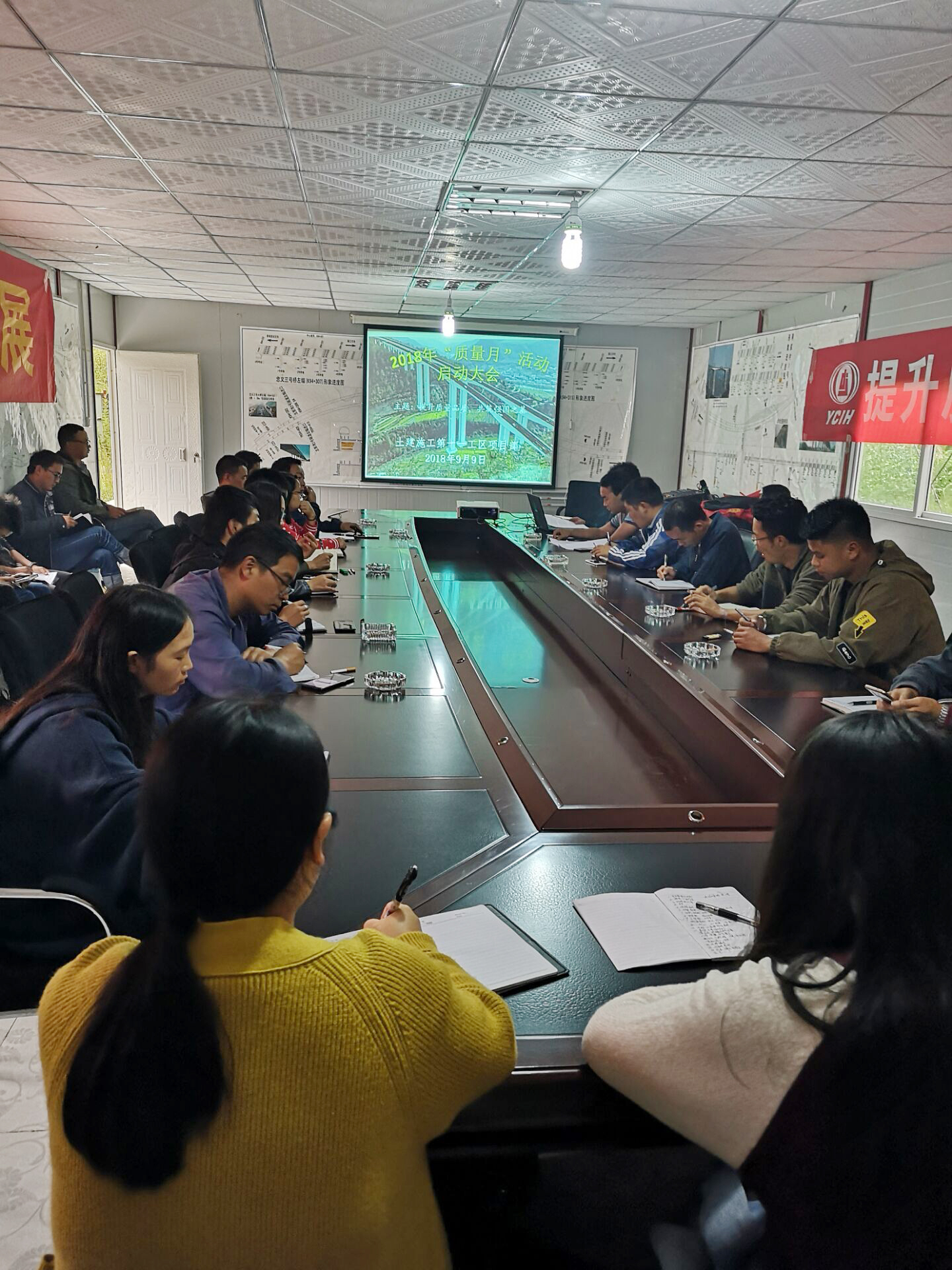 启动仪式上全体参会人员在写有“质量月”活动主体的宣传横幅上进行签名。生产副经理陈文为本次大会做了总结,指出活动的目的是“加速推进质量强国、质量企业,全面提高职工的质量管理水平。”会议结束后项目部还组织人员在项目部驻地和施工现场进行活动横幅粘贴,营造浓厚的活动氛围。