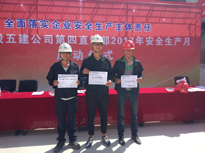 启动仪式上,直管部安全总监宣读了《云南建投第五建设有限公司第四直管部2017年“安全生产月”活动方案》,直管部党支部、工会和团支部还同时启动了“青年安全和产示范岗”创建评比活动,劳务班组作业人员代表、项目经理作了安全生产宣誓并承诺,与会领导为各项目部及班组发放了安全生产宣传资料及“送清凉”的防暑药品,将直管部的关心带到施工一线,为广大一线员工带来清凉。
