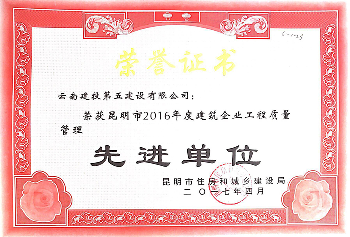 技术支持: 方森科技 5月11日,昆明市住房和城乡建设局召开了2016年度昆明市建设工程质量管理、安全生产、文明施工总结暨2017年工作部署会。会上,公司荣获昆明市2016年度建设企业安全生产“先进单位”、工程质量管理“先进单位”两项荣誉,由直二部施工的云南省2013-2017年城市棚户区改造省级统贷项目(六期)安宁太平新城二期一标工地分别荣获2016年度昆明市建设施工安全生产标准化工地和昆明市建筑工程2016年度整治工地乱象暨文明施工优良工地两项荣誉。第三直管项目部施工的云南省少数民族语言节目译制中心(含演播厅)项目、五○六直管项目部施工的云南烟叶醇化仓储中心项目(一期)3#醇化库及4#醇化库分别获评2016年度昆明市建设施工安全生产标准化工地,丁晨然、喻心伟、钱光能、赵连飞荣获昆明市2016年度建筑企业安全生产先进个人,韩叶龙、姚鹏荣获昆明市2016年度建筑企业工程质量管理先进个人。