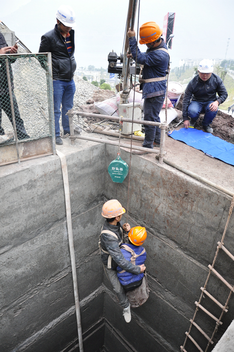 上午9点30分,演练正式开始,一名施工人员在井底模拟昏迷状态,井上操作工人在呼叫没有反应后马上将情况汇报到现场施工班组长处,班组长核实后立即向项目部管理人员进行报告,并在第一时间使用通风设备对井底送风,改善井内空气质量。项目部接到报告后立即启动应急预案,现场管理人员按照预案分成了疏散组、抢险救护组等应急小组赶往现场开展救援工作。抵达现场后,管理人员迅速将井底晕倒操作工救出,移至空气新鲜、通风良好的地方,并对其进行人工抢救,待工人状况稍稳定后,迅速将其转移到一旁等候的车辆上送往最近的医院进行救治。