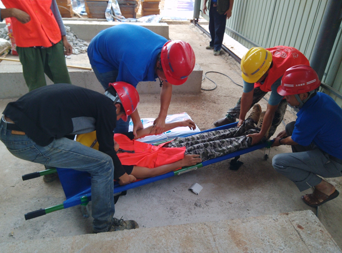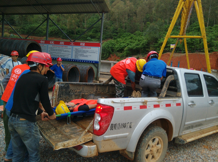 项目部模拟了电工在预制场内梳理电线时,由于电源线绝缘层破损漏电造成触电的事故现场。演练中,现场作业人员在发现事故后,立即向现场负责人报告,接到报告后现场负责人马上汇报项目负责人,项目负责人立即启动触电事故应急救援程序,组织人员对触电者进行急救,并向当地医院请求救援,由于触电者“伤势严重”,医院救护车辆仍未到达,应急救援指挥长马上组织人员将伤者移至应急救援车辆上并出发,在应急救护小组成员的陪同下与医院救护车接头。