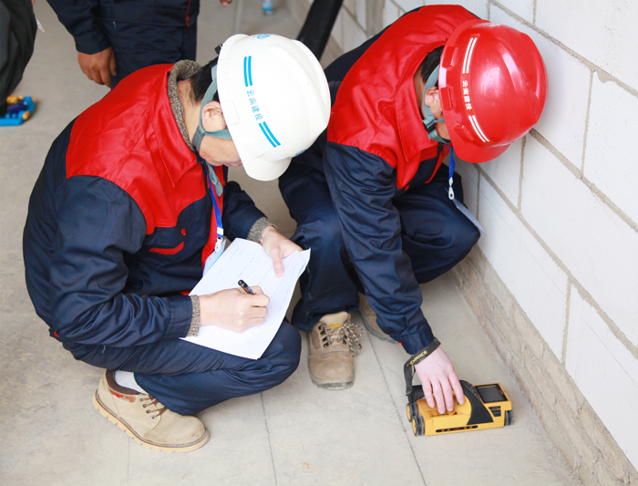 竞赛历时一天,共有来自18个直管部的108名参赛选手参加,按照比赛规则分为A、B两组,每组三人。比赛地点设置在兴冶广场建设项目一标段一栋号5楼,设有6个比赛工位。参赛选手们摩拳擦掌,赛前仔细检查设备,在裁判“开始竞赛”的口令后,迅速进入比赛状态。检测楼板厚度、激光测量距离、混凝土钢筋的进一步检测……每一步,都要精准。他们不慌不忙,分工明确,一个人测量,一个人记录数据,另一个人则根据测量的数据进行计算。裁判们也以严谨的态度和“公平、公正、公开”的原则认真记录。比赛时,常常有阵阵凉风透过未封的单侧墙面,朝竞赛人员和裁判呼啸而来,但他们丝毫不受影响,现场充满了爱岗敬业、钻研技术的浓厚氛围。