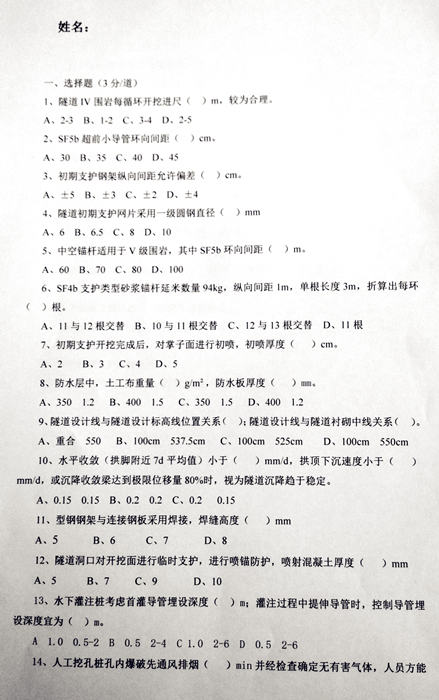 考试针对施工环节中易忽视的问题,重点考察了桥梁、隧道的规范及施工工艺,并采取图纸与规范相结合的方式梳理了整个工程项目的施工概况。其中,隧道考察范围包括:围岩类型、超前预报、支护、安全、质量等;桥梁考察范围包括:调拱、调坡、平整度和压实度的控制,特别考核了桩基施工中的主控项目指标。