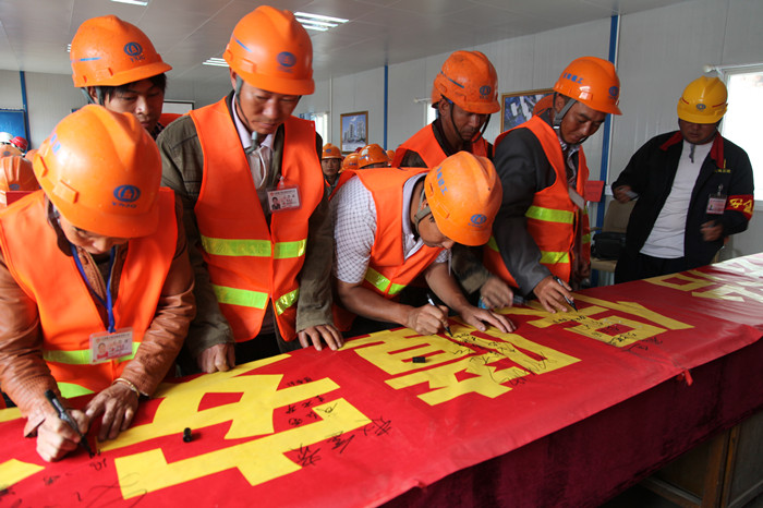 接着,劳务班组的柳小明代表项目部的全体工人作宣誓承诺:“我们广大工人是安全生产的具体参与者,也是直接受益者……我们要确保在工作中扎实做到‘四不伤害’:不伤害他人,不伤害自己,不被他人伤害,保护他人不受伤害……”