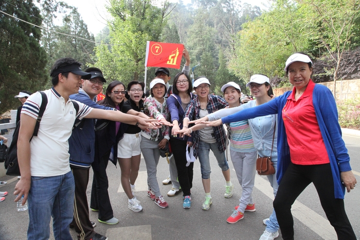 途中大家挥舞着自己队伍的旗帜并不时地高喊着口号,一旦有人掉队就会有其他同伴一起搀扶着向前进。董事长还带领大家跑步向前,大家齐心协力大步向前进,途经华亭寺后便直达终点——聂耳墓。不到一个小时的功夫,“攀高队”就率先到达了目的地,其他队伍也陆续抵达终点。本次登山比赛,最快的队员历时44分钟便到达了终点,最后一个到达的队员也仅用了55分钟。最先到达终点的前十名队员参加了关于公司历史沿革及企业文化的有奖问答活动,并对答对的人给予了奖励。