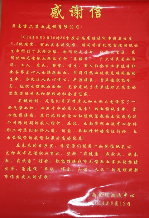 “关键时刻,是您们用深情厚谊和无私大爱谱写了一曲气势如虹,血浓于水的感人篇章……”8月19日,云南昆明血液中心向公司赠送感谢信。