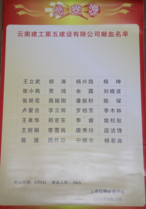 8月8日下午,公司组织33名志愿者到云南昆明血液中心献血,总献血量达7800ml,并且还有不少职工都自发的去献血,助人为乐。