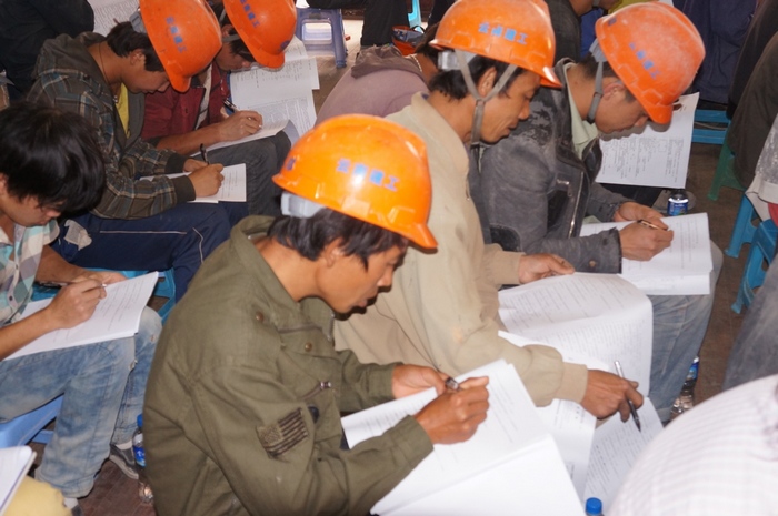 根据云南建工集团培训中心2013年对农民工专业技能培训取证的要求,项目部提前租借了河北社村委会会堂作为培训地点,邀请了集团培训中心的老师进行授课,直管部主要领导也参与了培训活动。