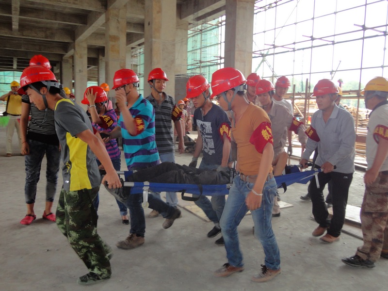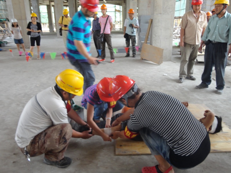 “事故”发生后,项目部安全员李福第一时间向项目部经理董波汇报,董波立即向上级部门汇报情况,并拨打了120急救电话,随后立即指挥应急救援小组开展救援。现场保卫人员拉起警戒线维持现场,抢救小组赶到事故现场拆除坍塌模板解救受伤人员,并对伤员伤口进行简单的处理与包扎,等待救护车的到来……整个演练过程历时二十多分钟,大家有条不紊地参与了整个救援过程。