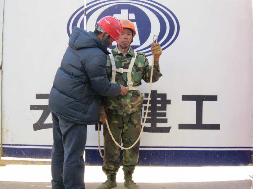 图为项目部管理人员讲解高空作业时安全绳的使用方法