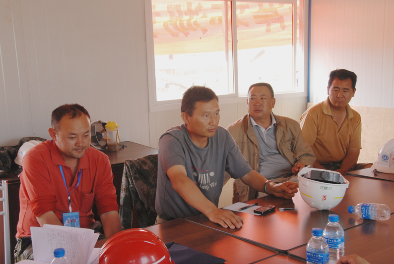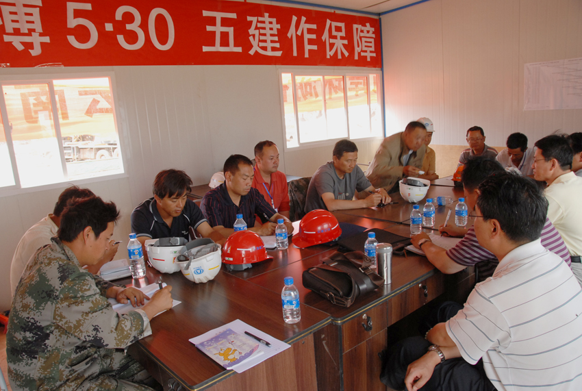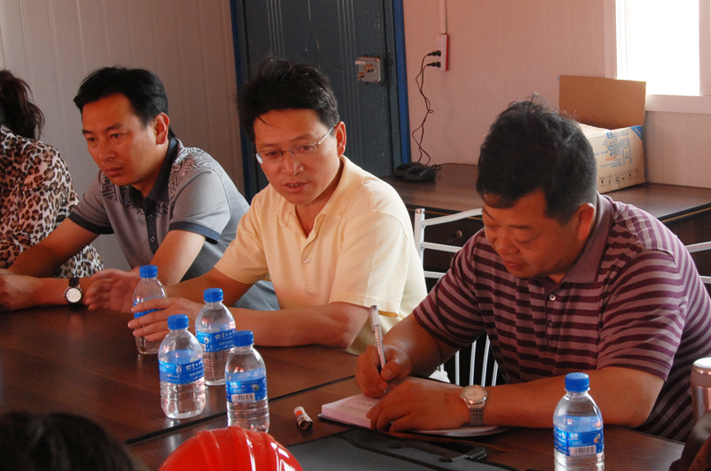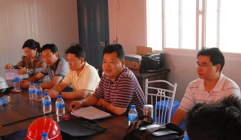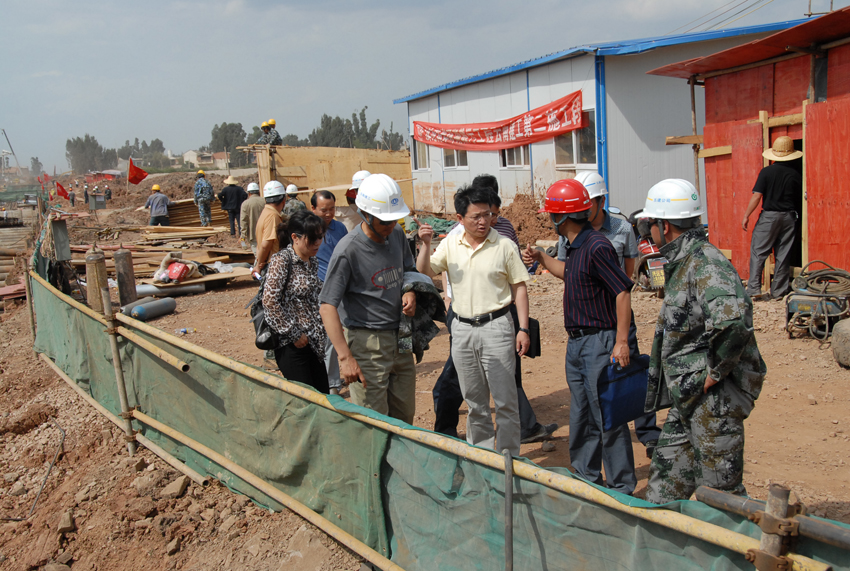 公司副总经理兼第三直管部经理段培勇介绍了工程施工组织管理情况。该工程的工期十分紧张,从4月6日根据建工集团要求紧急进场增援施工以来,五建公司第三直管部、五建市政工程公司以及近日进场的503直管部一直昼夜施工,连续奋战,没有休过一天的节假日。工程场地非常狭窄,几乎天天都要为寻找堆土场地费尽心思,还要花费大量精力协调与当地村民的关系。在整个工程施工中,不仅与集团内兄弟单位展开无形中的劳动竞赛,而且还要与国字号的专业队伍同台竞技。参建同志决心为公司和集团荣誉全力一搏,以优秀的建设业绩报答上级的信任。针对施工现场地处低洼排水不畅、淤积泥土极其松软的地质条件,提出了分工合作、协同作战,抢在雨天到来之前全力拼搏抢进度的工作思路。