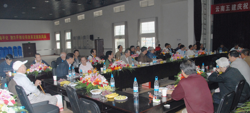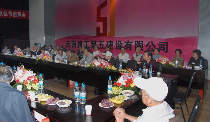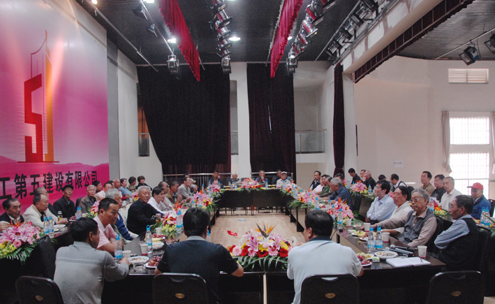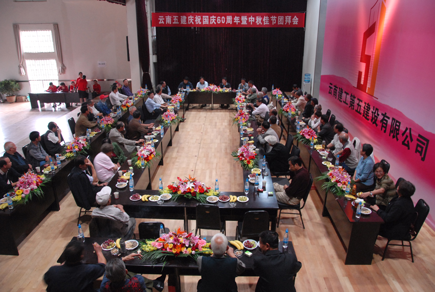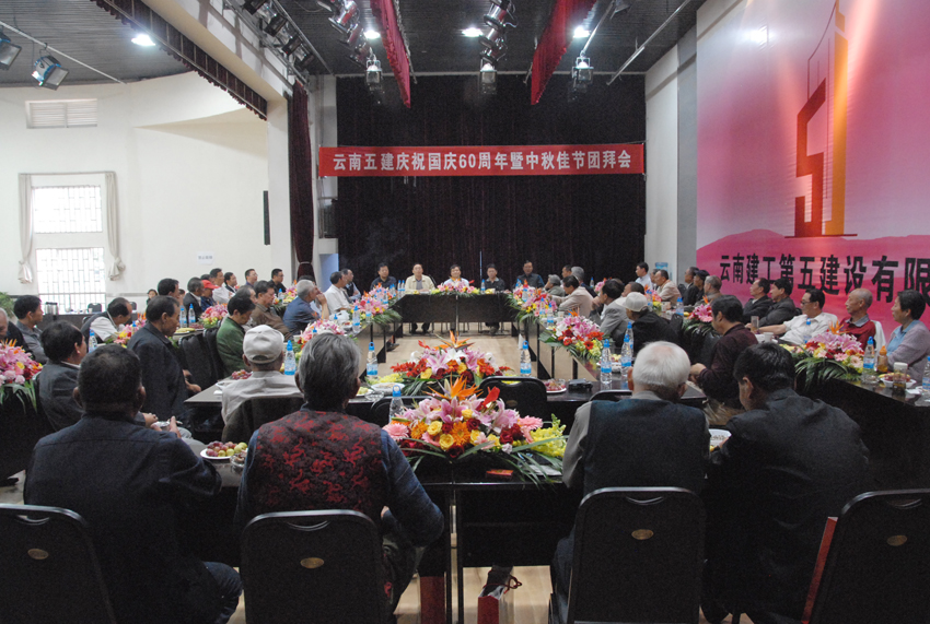 五建设有限公司于9月25日召开庆祝新中国建立六十周年国庆暨中秋佳节团拜会,离退休的公司原老领导、老劳模、老同志以及调任上级部门和兄弟单位领导代表与现任公司领导班子成员齐聚一堂,结合公司发展畅谈国家发展变化。