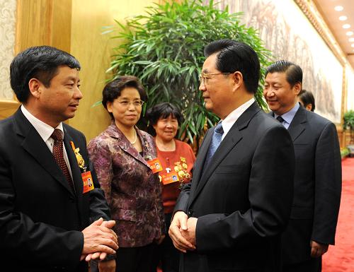 10月21日,党和国家领导人胡锦涛、习近平等在北京人民大会堂同全国总工会新一届领导班子成员和中国工会十五大部分代表座谈。这是胡锦涛等同代表们亲切交谈。新华社记者 饶爱民摄