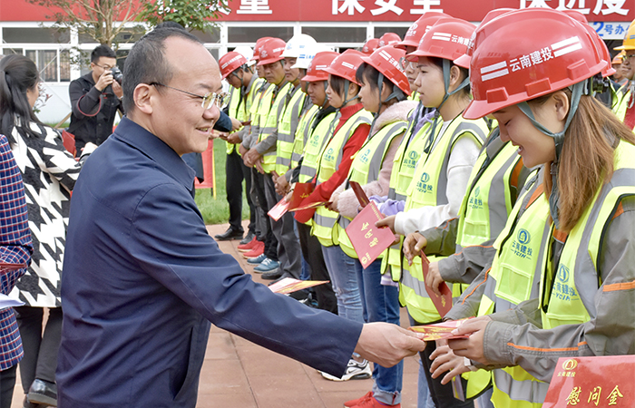 9月18日上午,集团公司党委副书记、工会主席陈文双到公司云南绿色能源产业园区项目对奋战在一线的114名项目管理人员和50名民工代表进行慰问,集团工会副主席赵艳波,公司党委书记、副董事长张晓峰,总经济师吕荣伟,工会主席冷蕊参加慰问。