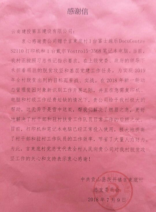 捐赠办公设备 助力脱贫攻坚——公司收获吉束底村感谢信