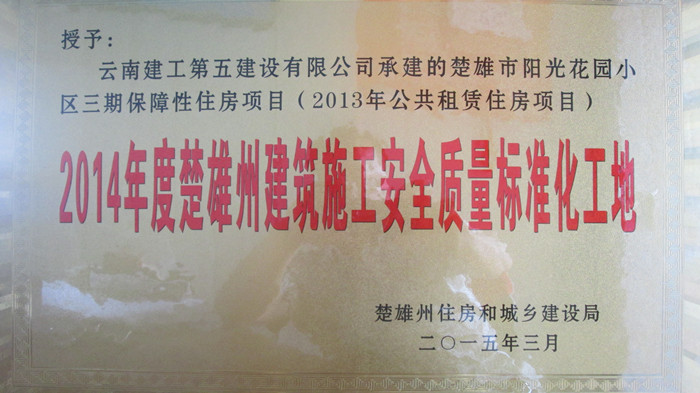 一分耕耘,一分收获。近日,由五〇三直管项目部负责施工的楚雄市阳光花园小区三期保障性住房项目荣获“2014年度楚雄州建筑施工安全质量标准化工地”荣誉称号。并于2015年3月24日正式授牌。 楚雄市阳光花园小区三期保障性住房项目总建筑面积为61103.75平方米。包括7栋、8栋、9栋、10栋、11栋共五栋,地下一层,地上18层...