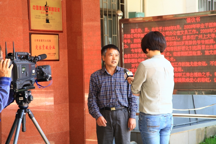 9月11日,云南日报、云南广播电视台(电视、电台)、云南网、春城晚报、云南信息报、云南政协报、云南法制报、生活新报等多家媒体组成记者团,由省委宣传部宣传教育处带队到公司对施尤俊捐肝救母的感人事迹进行相关采访。 公司董事长李文智,党委书记李兴奎,党委副书记、纪委书记吴倩等领导及部分干部职工配合接受了媒体采访。 8月20日,《云南日报》和《春城晚报》分别推出《80后小伙捐肝救母…