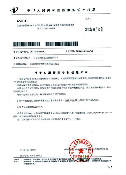 3月22日,第一安装直管项目部在公司相关部门的指导下,荣获国家实用新型专利《大口径球墨铸铁管连续试压装置》。 在大理三库连通项目的施工过程中,如何给1.2米的大口径球墨铸铁管进行试压是第一安装直管项目部面临的一大考验。在听取了多个设计单位、生产单位的建议后,揉合以往的相关经验,直管部研发出一套满足试验要求的“连续试压装置”。工程项目竣工之后,直管部积极总结施工经验,...