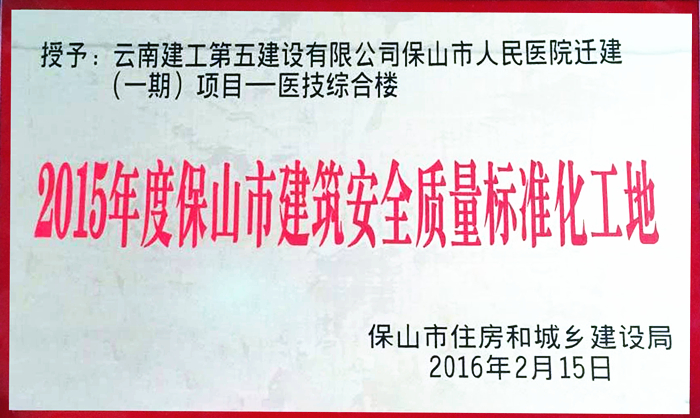 2016年3月,由公司承建第四直管项目部施工的保山市人民医院迁建(一期)项目——医技综合楼及龙陵财富中心建设项目两个工程均荣获“2015年保山市建筑安全质量标准化工地”。 保山市人民医院迁建(一期)项目——医技综合楼,总建筑面积为41478平方米,包括新建五层框架结构门急诊综合楼一幢,建筑面积为22789平方米(含全科医生...