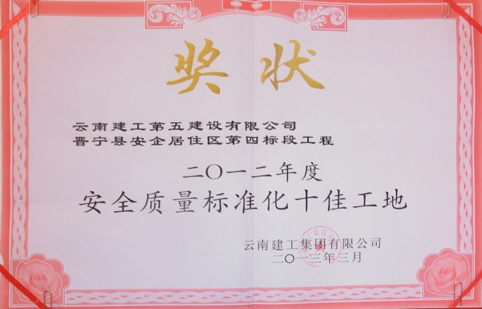 近日,公司五〇三直管项目部承建的晋宁县安企居住区第四标段工程被云南建工集团有限公司授予二〇一二年度“安全质量标准化十佳工地”荣誉证书,另外,该工程在2012年昆明市建筑施工安全质量标准化工地评比中,还被昆明市住房和城乡建设局授予“示范工地”奖牌和荣誉证书。 晋宁县安企居住区第四标段工程建筑面积88000平方米,于2013年...